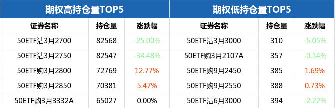 从持仓量来看,50ETF期权合约中,50ETF沽3月2700持仓量最大,为82568张,期权全日下跌25.00%,报收0.0018元;持仓量最小的为50ETF沽3月3000,共计310张,期权全日下跌5.05%,报收0.1917元。