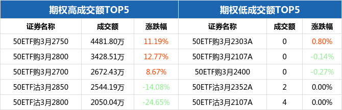 从成交额来看,50ETF期权合约中,50ETF购3月2750成交额最高,为4481.8万元,全日上涨11.19%,报收0.0656元;而最低的为50ETF购3月2400,成交额为0元,全日下跌0.27%,报收0.399元。