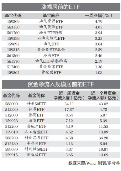 上周,市场震荡调整,但油气资源、黄金股相关ETF逆市上涨。