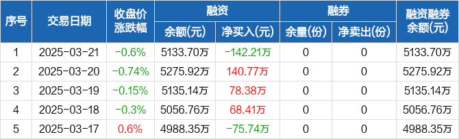 农业ETF:融资净偿还142.21万元,融资余额5133.7万元(03-21)