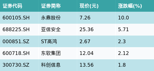 截至收盘,数据安全主题涨跌幅最高的五只股票为:永鼎股份(600105.SH)、亚信安全(688225.SH)、ST高鸿(000851.SZ)、东软集团(600718.SH)与科创信息(300730.SZ)。详情见下表: