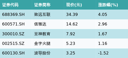 截至收盘,微信小程序主题涨跌幅最高的五只股票为:致远互联(688369.SH)、信雅达(600571.SH)、豆神教育(300010.SZ)、金字火腿(002515.SZ)与波导股份(600130.SH)。详情见下表: