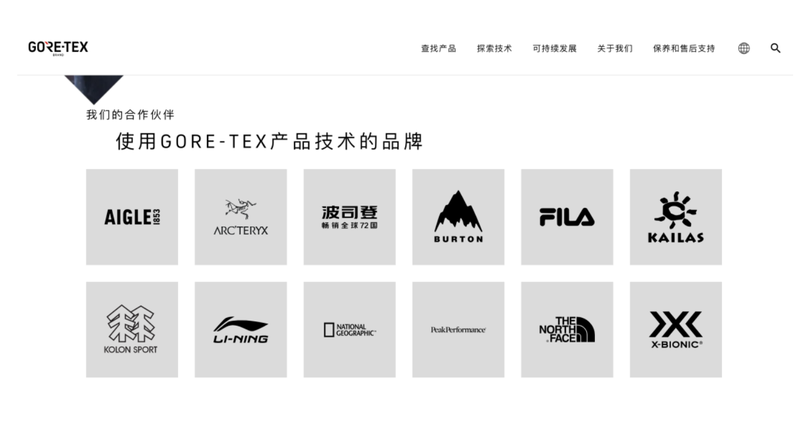 在GORE-TEX官网上可以看到,始祖鸟(ARCTERYX)、猛犸象(Mammut)、巴塔哥尼亚(Patagonia)、北面(The North Face)等众多一线户外品牌均使用了GORE-TEX的技术。