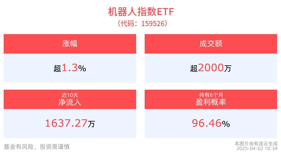 拉长时间看,截至2025年4月1日,机器人指数ETF近3月累计上涨14.55%。资金流入方面,机器人指数ETF最新资金净流入196.89万元。拉长时间看,近10个交易日内,合计“吸金”1637.27万元。