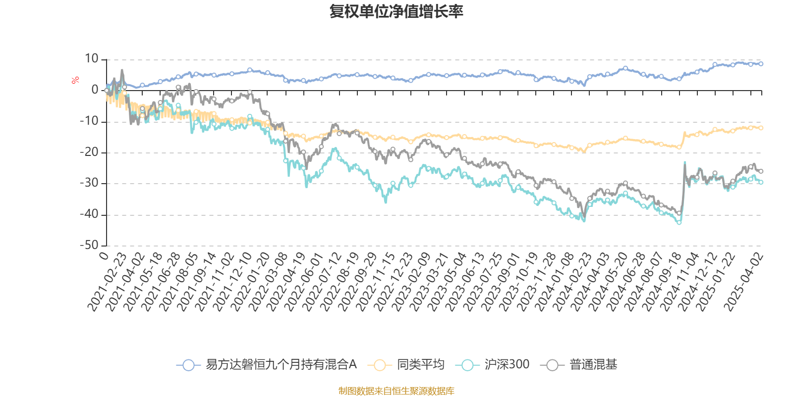 截至4月2日,易方达磐恒九个月持有混合A近三个月复权单位净值增长率为0.29%,位于同类可比基金488/670;近半年复权单位净值增长率为3.00%,位于同类可比基金187/670;近一年复权单位净值增长率为3.10%,位于同类可比基金501/667;近三年复权单位净值增长率为5.02%,位于同类可比基金290/559。