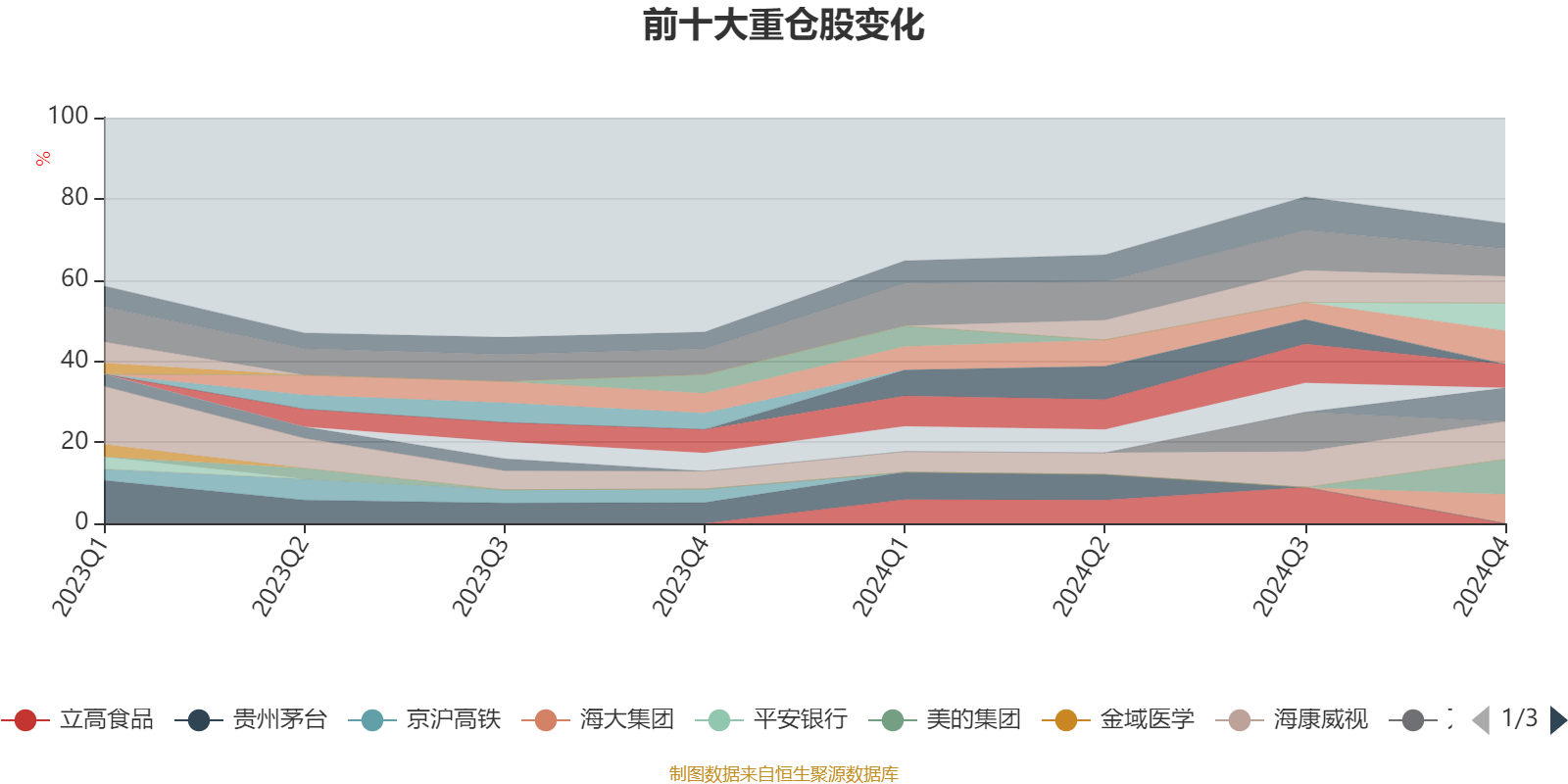 截至2024年末,基金十大重仓股分别是海康威视、美的集团、邮储银行、长江电力、海大集团、五粮液、顺丰控股、招商银行、扬农化工、极米科技。