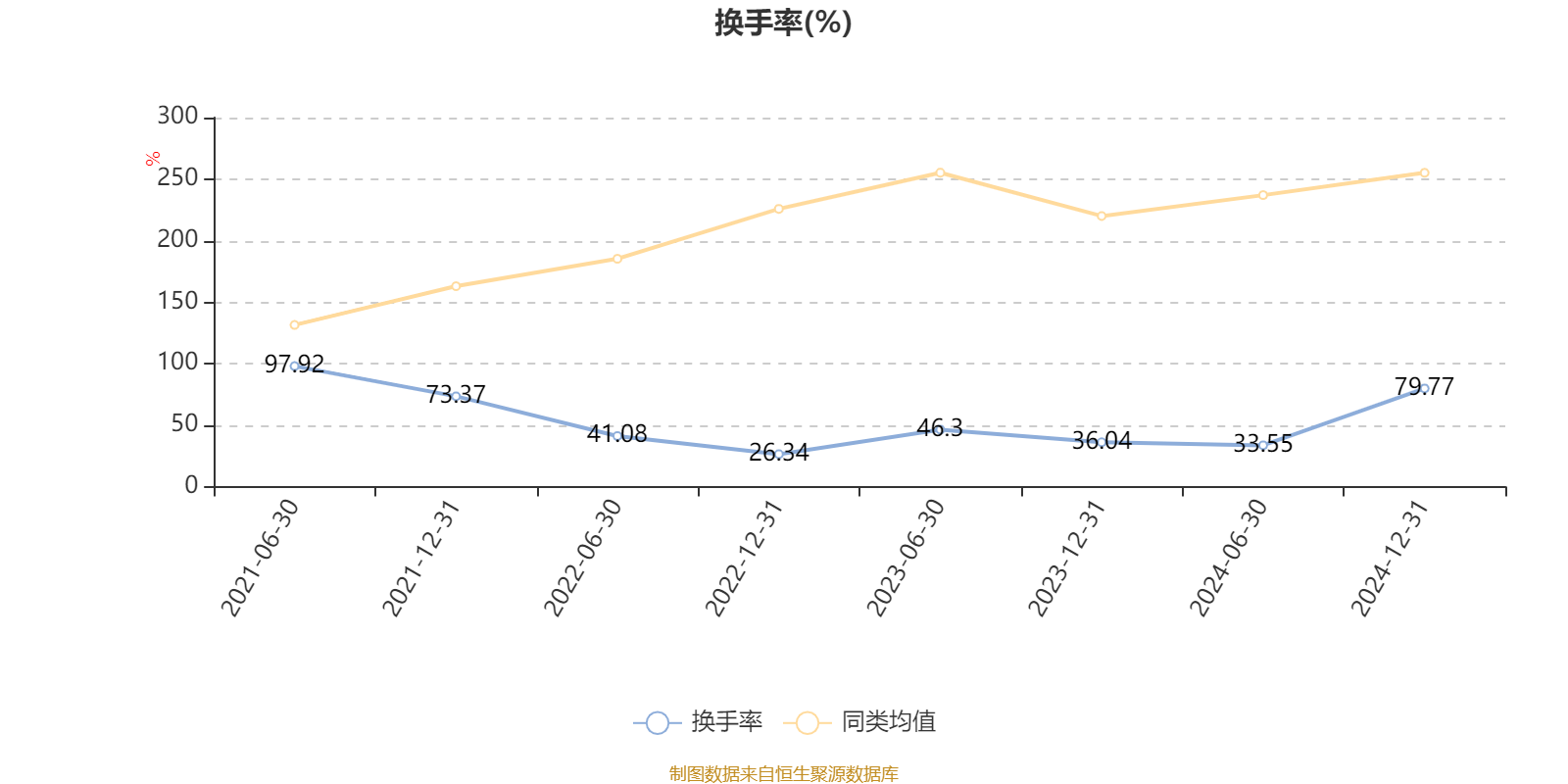 截至2024年12月31日,基金最近一年换手率约98.78%,持续低于同类均值。