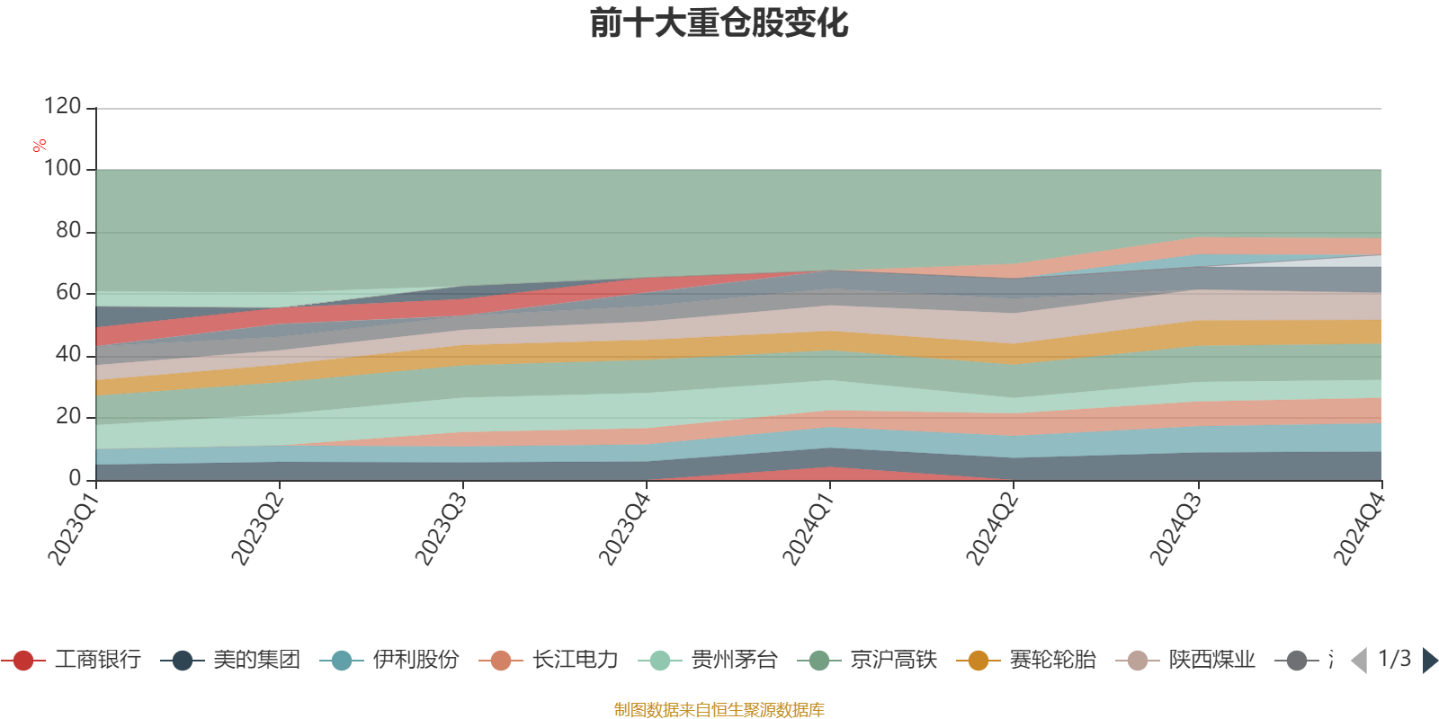该基金持股集中度较高,近2年前十大重仓股集中度长期超过60%。截至2024年末,基金十大重仓股分别是京沪高铁、伊利股份、美的集团、陕西煤业、招商公路、长江电力、赛轮轮胎、贵州茅台、扬农化工、建设银行。