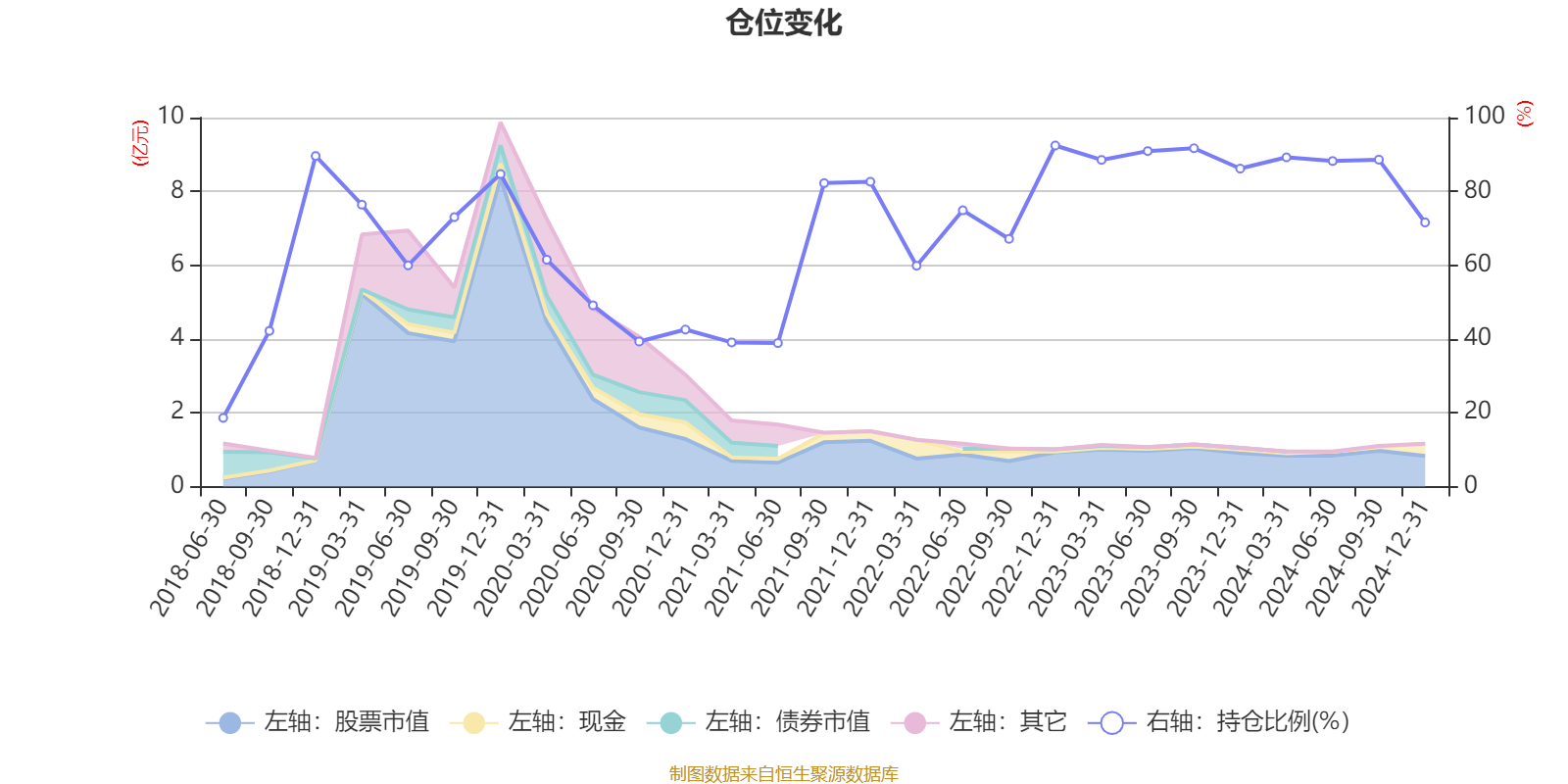 据定期报告数据统计,近三年平均股票仓位为82.44%,同类平均为84.66%。2022年末基金达到92.43%的最高仓位,2018年上半年末最低,为18.61%。