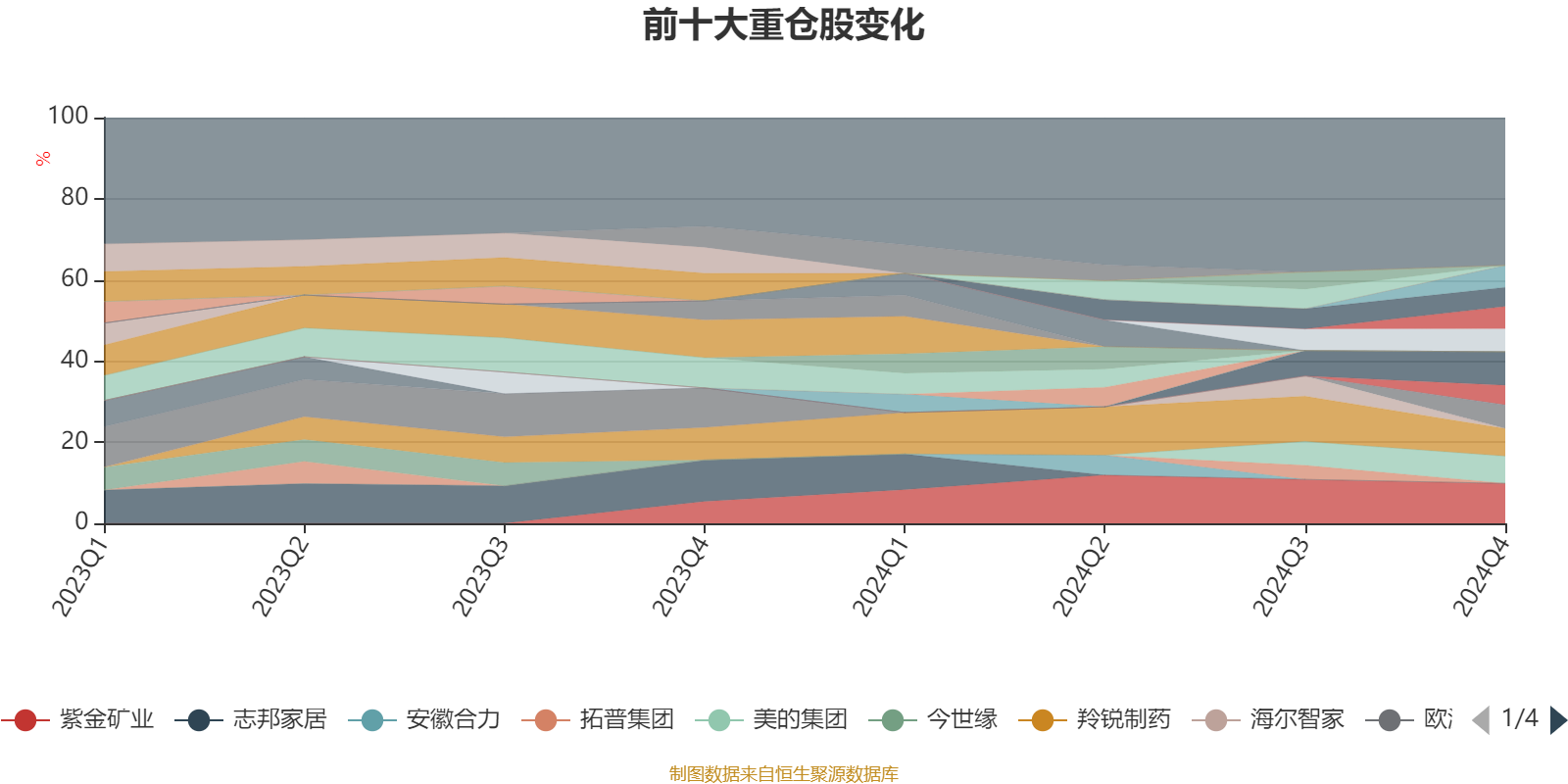 该基金持股集中度较高,近2年前十大重仓股集中度长期超过60%。截至2024年末,基金十大重仓股分别是紫金矿业、宁德时代、羚锐制药、美的集团、欧派家居、比亚迪、慕思股份、杰瑞股份、神火股份、洛阳钼业。