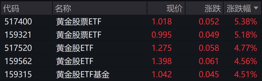 受盘面影响,跟踪中证沪深港黄金产业股票指数的ETF涨超4%。