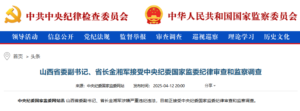 中央纪委国家监委网站4月12日晚8点消息,山西省委副书记、省长金湘军涉嫌严重违纪违法,目前正接受中央纪委国家监委纪律审查和监察调查。