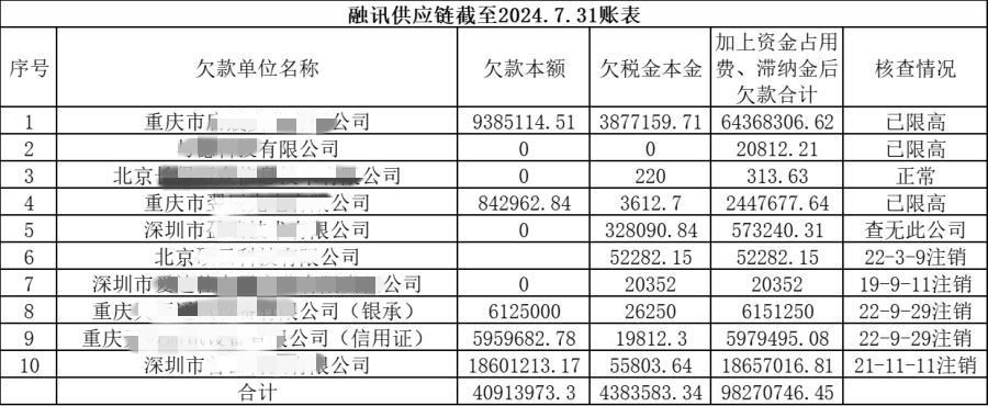 根据拍卖公告,截至2024年7月底,融讯供应链公司共有10笔应收账款,欠款金额合计约4091万元,加上资金占用费、滞纳金后欠款合计约9827万元。