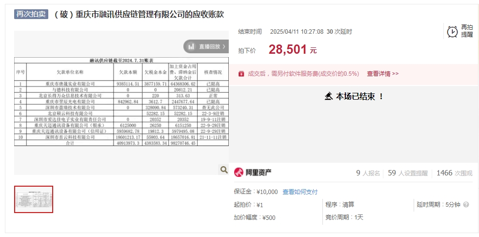 近日,重庆市融讯供应链管理有限公司(以下简称“融讯供应链公司”)约9827万元的应收账款上架阿里资产拍卖平台。