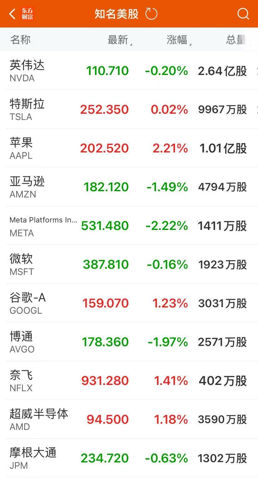 大型科技股涨跌互现,苹果涨2.21%,微软跌0.16%,英伟达跌0.20%,谷歌涨1.23%,亚马逊跌1.49%,Meta跌2.22%,特斯拉涨0.02%。