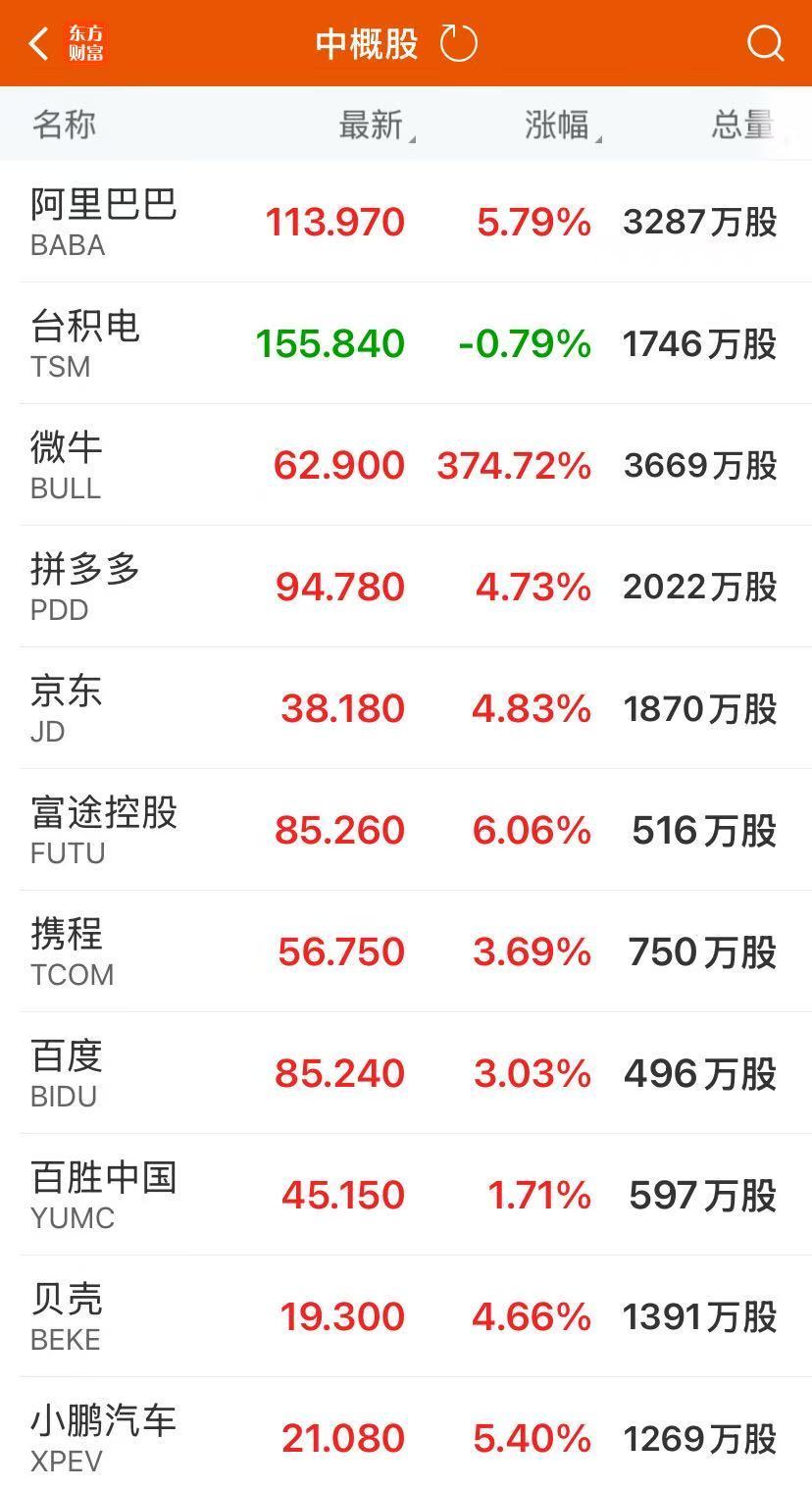 热门中概股普涨,纳斯达克中国金龙指数涨3.23%,阿里巴巴涨5.79%,京东涨4.83%,拼多多涨4.73%,蔚来汽车涨2.56%,小鹏汽车涨5.40%,理想汽车涨2.67%,哔哩哔哩涨1.98%,百度涨3.03%,网易跌0.03%,腾讯音乐涨3.27%。微牛涨374.72%,报收62.90美元,多次触及熔断。