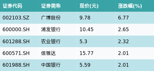 截至早盘收盘,跨境支付(CIPS)主题涨跌幅最高的五只股票为:广博股份(002103.SZ)、浦发银行(600000.SH)、农业银行(601288.SH)、信雅达(600571.SH)与中国银行(601988.SH)。详情见下表: