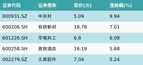 截至早盘收盘,北京主题涨跌幅最高的五只股票为:中关村(000931.SZ)、有研新材(600206.SH)、华电科工(601226.SH)、首旅酒店(600258.SH)与久其软件(002279.SZ)。详情见下表: