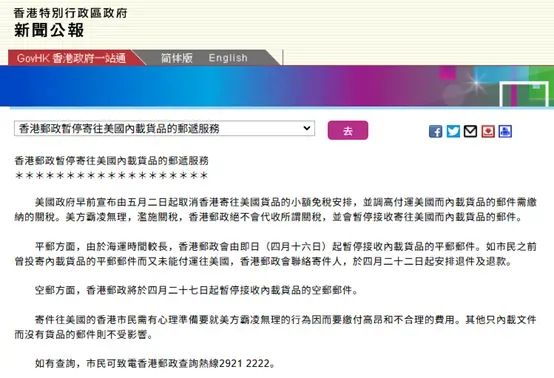 香港邮政暂停寄往美国内载货品的邮递服务
