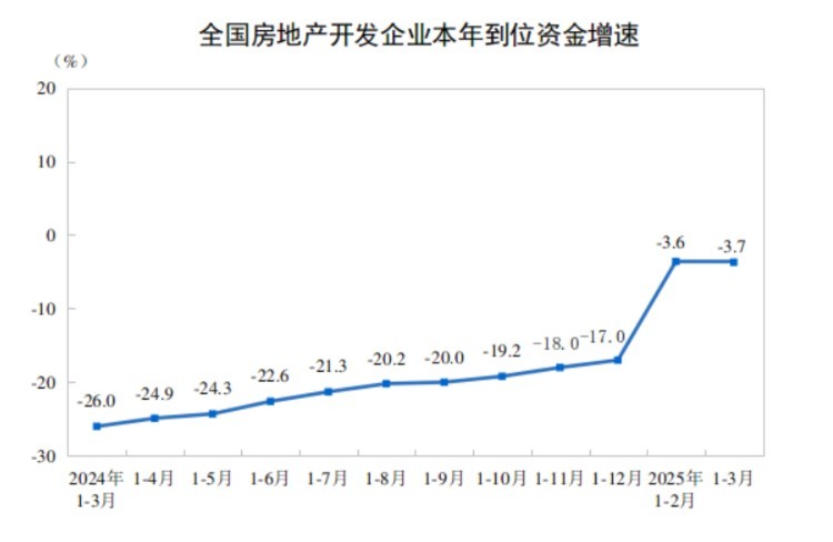 国家统计局数据显示,1-3月份,房地产开发企业到位资金24729亿元,同比下降3.7%。其中,国内贷款4441亿元,下降2.3%;利用外资1亿元,下降83.2%;自筹资金8168亿元,下降5.8%;定金及预收款7335亿元,下降1.1%;个人按揭贷款3373亿元,下降7.0%,降幅收窄4.7个百分点。