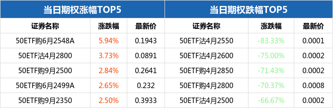 50ETF期权当日有138个合约正在交易。从涨跌幅来看,50ETF期权合约中,50ETF购6月2548A涨幅最大,为5.94%,报收0.1943元;50ETF沽4月2550跌幅最大,为83.33%,报收0.0001元。