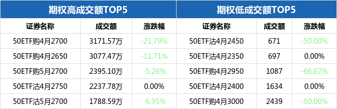 从成交额来看,50ETF期权合约中,50ETF购4月2700成交额最高,为3171.57万元,全日下跌21.79%,报收0.0201元;而最低的为50ETF沽4月2450,成交额为671元,全日下跌50.00%,报收0.0001元。