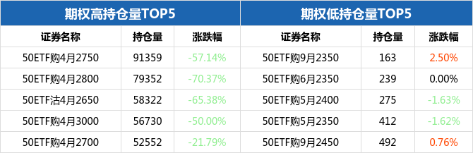 从持仓量来看,50ETF期权合约中,50ETF购4月2750持仓量最大,为91359张,期权全日下跌57.14%,报收0.003元;持仓量最小的为50ETF购9月2350,共计163张,期权全日上涨2.50%,报收0.3933元。