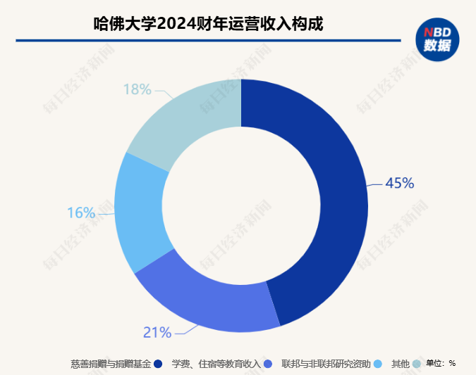 22亿美元,相当于哈佛大学2024财年全部研究资助收入的两倍以上。根据哈佛大学2024财年财务报告,学校全年总运营收入为65亿美元,其中约29亿美元(约45%)来自慈善捐赠与捐赠基金,约13.7亿美元(约21%)来自学费、住宿等教育收入,约10.4亿美元(约16%)来自联邦与非联邦研究资助。