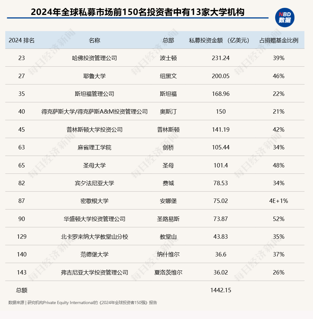 Private Equity International的数据也显示,2024年,私募市场前150名投资者中有13名大学机构投资者,投资总额超过1442亿美元。