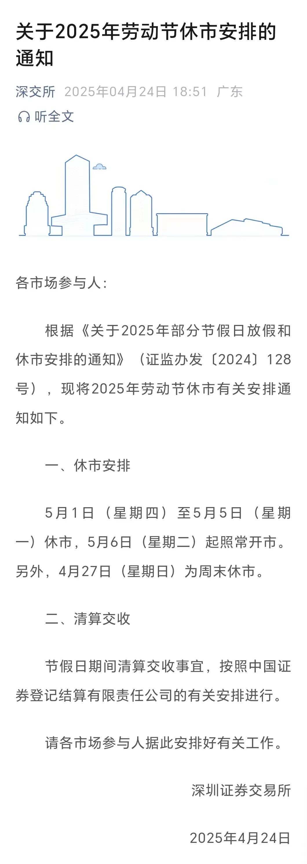 4月24日,上交所、深交所、北交所公布2025年劳动节休市安排:5月1日(星期四)至5月5日(星期一)休市,5月6日(星期二)起照常开市。另外,4月27日(星期日)为周末休市。