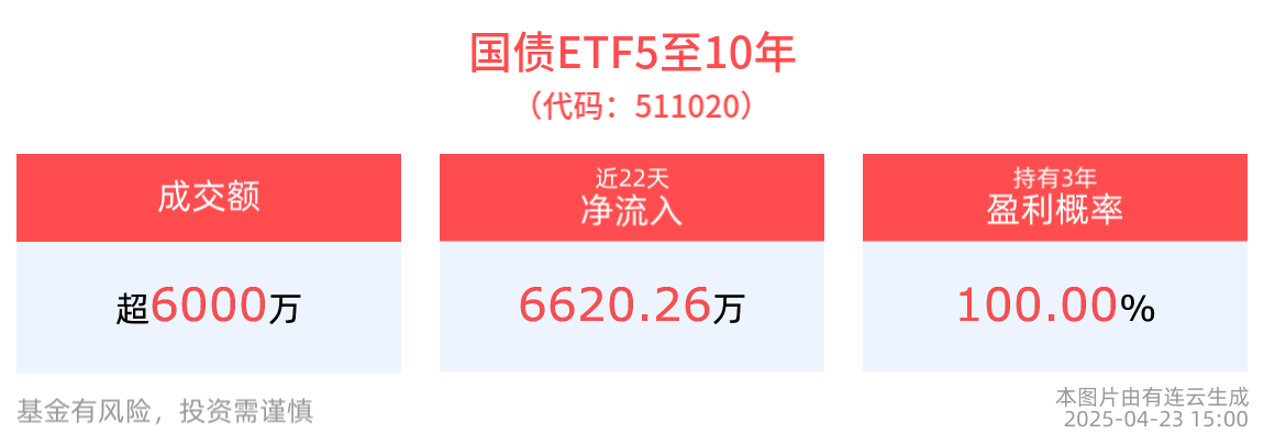 流动性方面,国债ETF5至10年盘中换手4.27%,成交6109.83万元。拉长时间看,截至4月23日,国债ETF5至10年近1年日均成交3.05亿元。