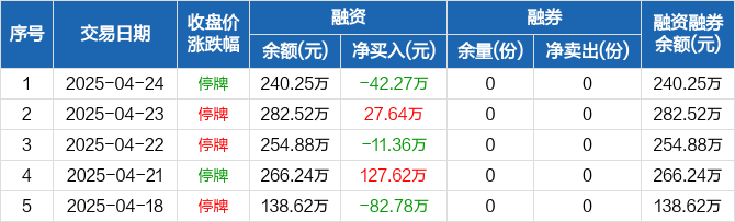 融资方面,当日融资买入63.96万元,融资偿还106.22万元,融资净偿还42.27万元。融券方面,融券卖出0份,融券偿还0份,融券余量0份,融券余额0元。融资融券余额合计240.25万元。