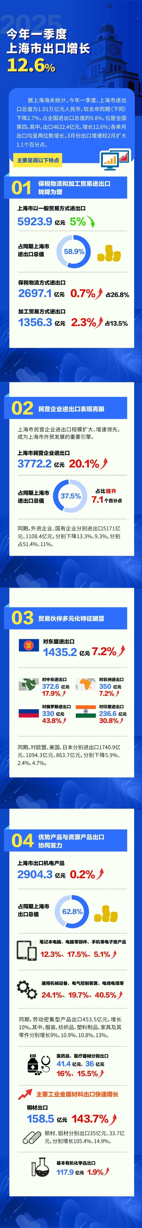 优势产品与资源产品出口协同发力。今年一季度,上海市出口机电产品2904.3亿元,增长0.2%,占同期上海市出口总值的62.8%。其中,笔记本电脑、电脑零部件、手机等电子类产品分别增长12.3%、17.5%、5.1%;通用机械设备、电气控制装置、电线电缆等分别增长24.1%、19.7%、40.5%。同期,劳动密集型产品出口453.5亿元,增长10%。其中,服装、纺织品、塑料制品、家具及其零件分别增长9%、10.9%、10.8%、13%。医药品、医疗器械分别出口41.4亿元、36亿元,分别增长16%、15.5%。主要工业金属材料出口快速增长,其中钢材出口158.5亿元,大幅增长143.7%;铜材、铝材分别出口35亿元、33.7亿元,分别增长了105.4%、14.9%。此外,基本有机化学品出口117.9亿元,增长1.9%。