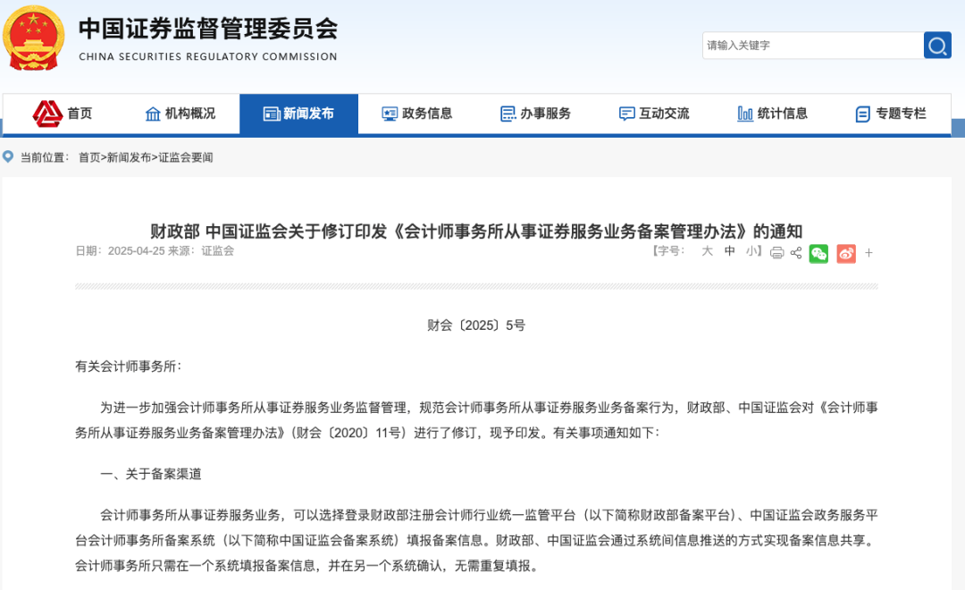 据中国证监会网站4月25日消息,为进一步加强会计师事务所从事证券服务业务监督管理,规范会计师事务所从事证券服务业务备案行为,财政部、中国证监会对《会计师事务所从事证券服务业务备案管理办法》(以下简称《办法》)进行了修订,并予印发。