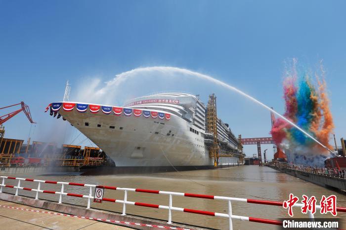 4月28日,中国第二艘国产大型邮轮“爱达·花城号”(H1509)在中国船舶集团有限公司旗下上海外高桥造船有限公司顺利实现坞内起浮。 中新社记者殷立勤摄