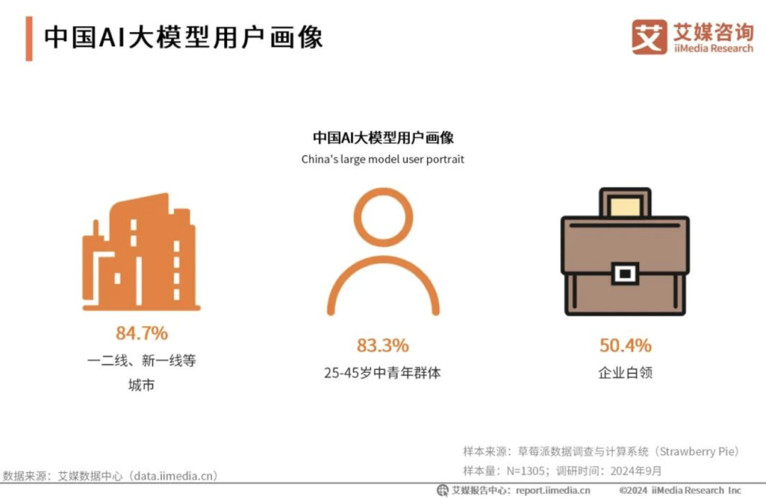 现下AI大模型已应用于多个领域,如AI导诊、智能客服和作业AI等,未来AI大模型将与更多行业进行深度融合,推动各行业的数字化转型和创新发展。艾媒咨询《2024~2025年中国AI大模型市场现状及发展趋势研究报告》显示,在一二线、新一线等城市聚集了全国近九成的AI大模型用户,中国AI大模型用户以25~45岁的中青年群体为主力军。