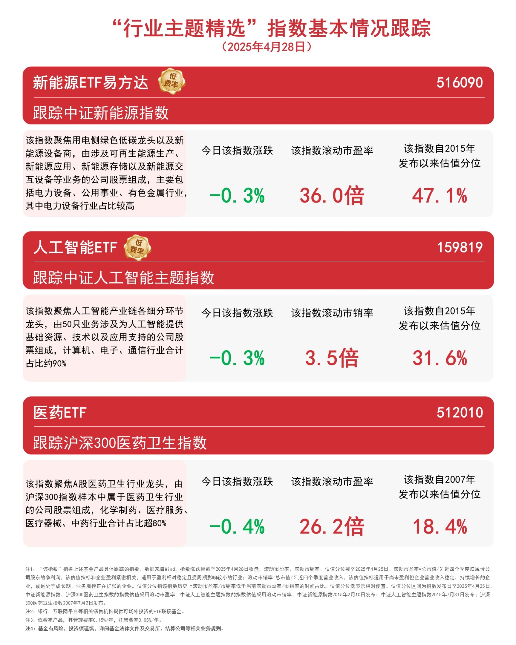 截至收盘,中证新能源指数、中证人工智能主题指数均下跌0.3%,沪深300医药卫生指数下跌0.4%。