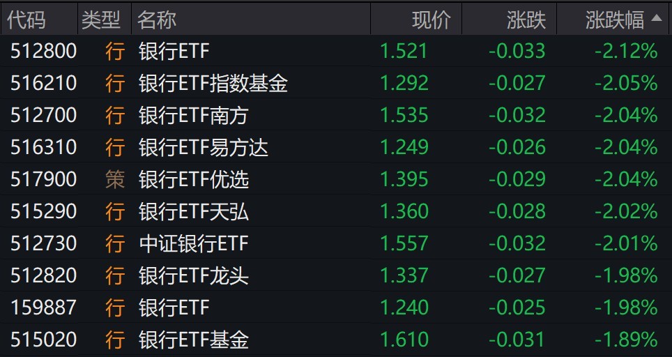 受重仓股调整影响,银行相关ETF跌约2%。