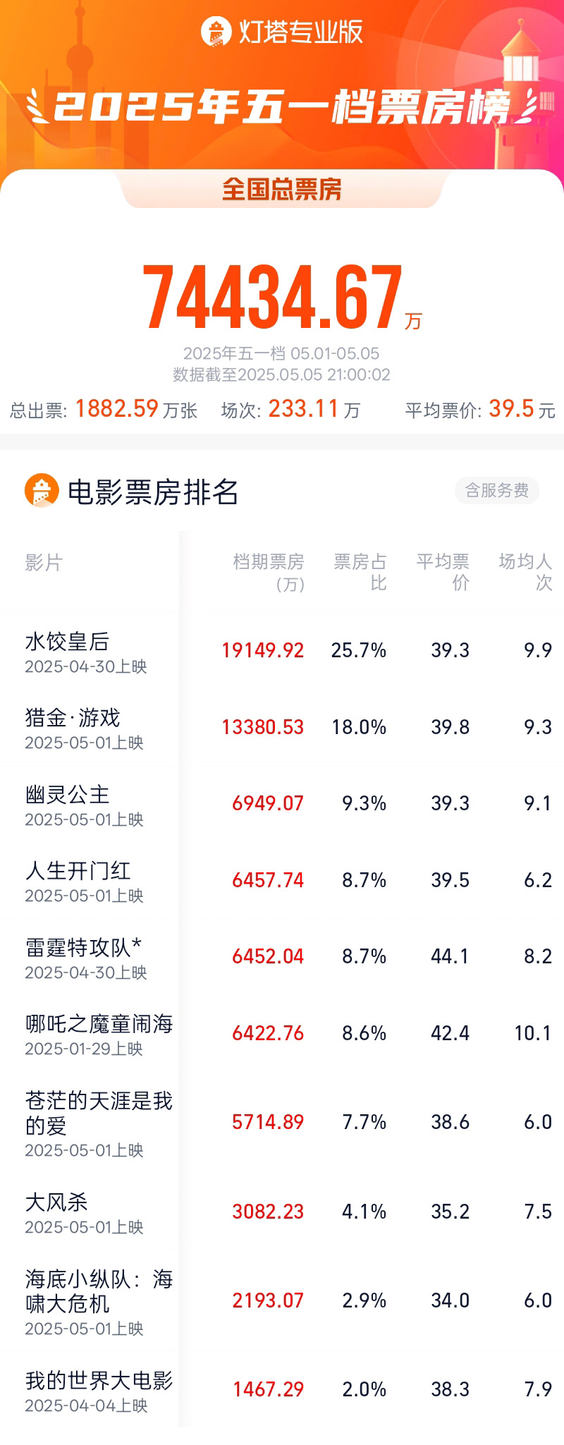 据灯塔专业版,截至5月5日21时,2025年五一档(5月1日-5月5日)档期总票房(含预售)突破7.44亿元,总人次1882.6万,总场次233.1万,影片《水饺皇后》《猎金·游戏》《幽灵公主》《哪吒之魔童闹海》《雷霆特攻队*》列票房前五名。其中,上海再次以较大优势领跑北京、深圳、广州,摘得档期城市票房排行榜冠军。