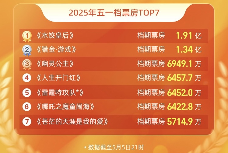 今年五一档有10部新片上映。最终,剧情片《水饺皇后》以1.91亿元领跑五一档(5月1日-5月5日)票房榜,影片上映6天累计票房达2.14亿元,也是今年五一档唯一票房突破2亿元大关的影片,在绝大多数省份(29个)票房暂列第一,根据灯塔AI票房预测显示,影片总票房预测达3.84亿元;犯罪片《猎金·游戏》档期票房1.34亿元暂列第二,影片在华南地区表现突出,尤其是在广西票房领先,宫崎骏动画《幽灵公主》首次在国内公映,该片豆瓣评分高达8.9,是无数影迷心中宫崎骏的“封神之作”,上映5天票房6949.1万元进入五一档票房榜前三。值得一提的是,已经上映97天《哪吒之魔童闹海》(下称《哪吒2》)档期票房达6457.7万元进入前四名,以6.4%的排片贡献8.8%的票房占比,场均人次更是五一档影片最高。