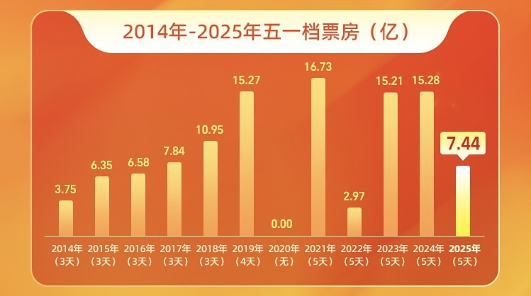 可喜的是,在《哪吒2》大幅度刷新全球单一市场最高票房纪录的助力下,截至5月5日,2025全年全国电影票房已达263.09亿元,相较去年同期提升30.7%,持续领跑全球电影市场。不过,正在冲击全球影史票房榜第四位的《哪吒2》也的确在一定程度上提前透支了部分清明档和五一档的电影观众,再加上短视频、短剧等碎片化娱乐方式的崛起(2024年微短剧市场规模达504.4亿元,超过电影市场总规模),以及线下演出市场火爆,正不断分流年轻观众,2025年五一档虽然新片总体类型和数量较为丰富,但档期总票房较2024年的15.28亿元和2023年的15.21亿元有不小的差距,距2021年的五一档票房历史最高纪录16.73亿元更是有超过9亿元的差距。7.44亿元这一数据略接近于2017年7.84亿元的成绩,不过当时的五一档仅为期三天。