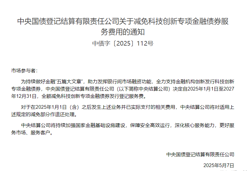 每经AI快讯,5月7日,中央结算公司官网发布公告,中央国债登记结算有限责任公司决定自2025年1月1日至2027年12月31日,全额减免科技创新专项金融债券发行登记服务费。对于在2025年1月1日(含)之后发生上述业务并已实际支付的相关费用,中央结算公司将对适用上述规定的减免部分作退还处理。