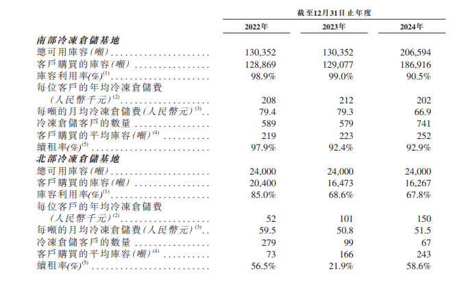 红星冷链还秉承“薄利多销”原则。以贡献主要库容的南方基地为例,2022年,每位客户的年均冷冻仓储费为20.8万元,2024年下降至20.2万元。每吨的月均冷冻仓储费从79.4元下降至66.9元。