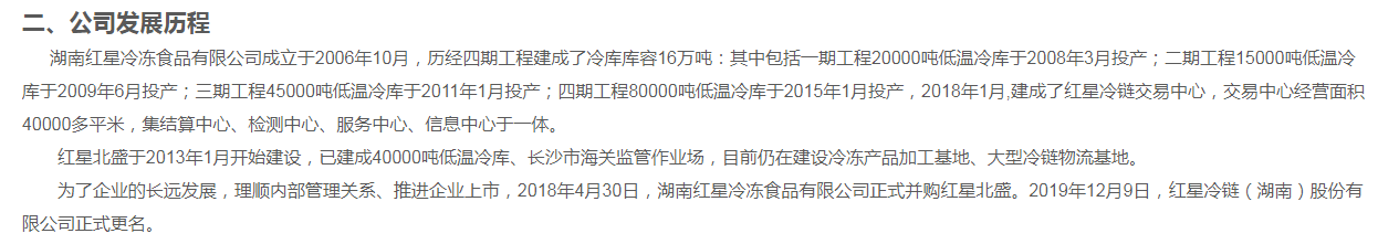 在红星冷链官网上,也有公司库容量的描述。红星冷链介绍,公司历经四期工程建成了冷库库容16万吨。