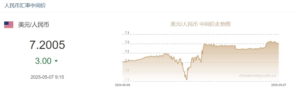 中新网5月7日电据中国外汇交易中心网站消息,中国人民银行授权中国外汇交易中心公布,2025年5月7日银行间外汇市场人民币汇率中间价为:1美元对人民币7.2005元,上调3个基点。