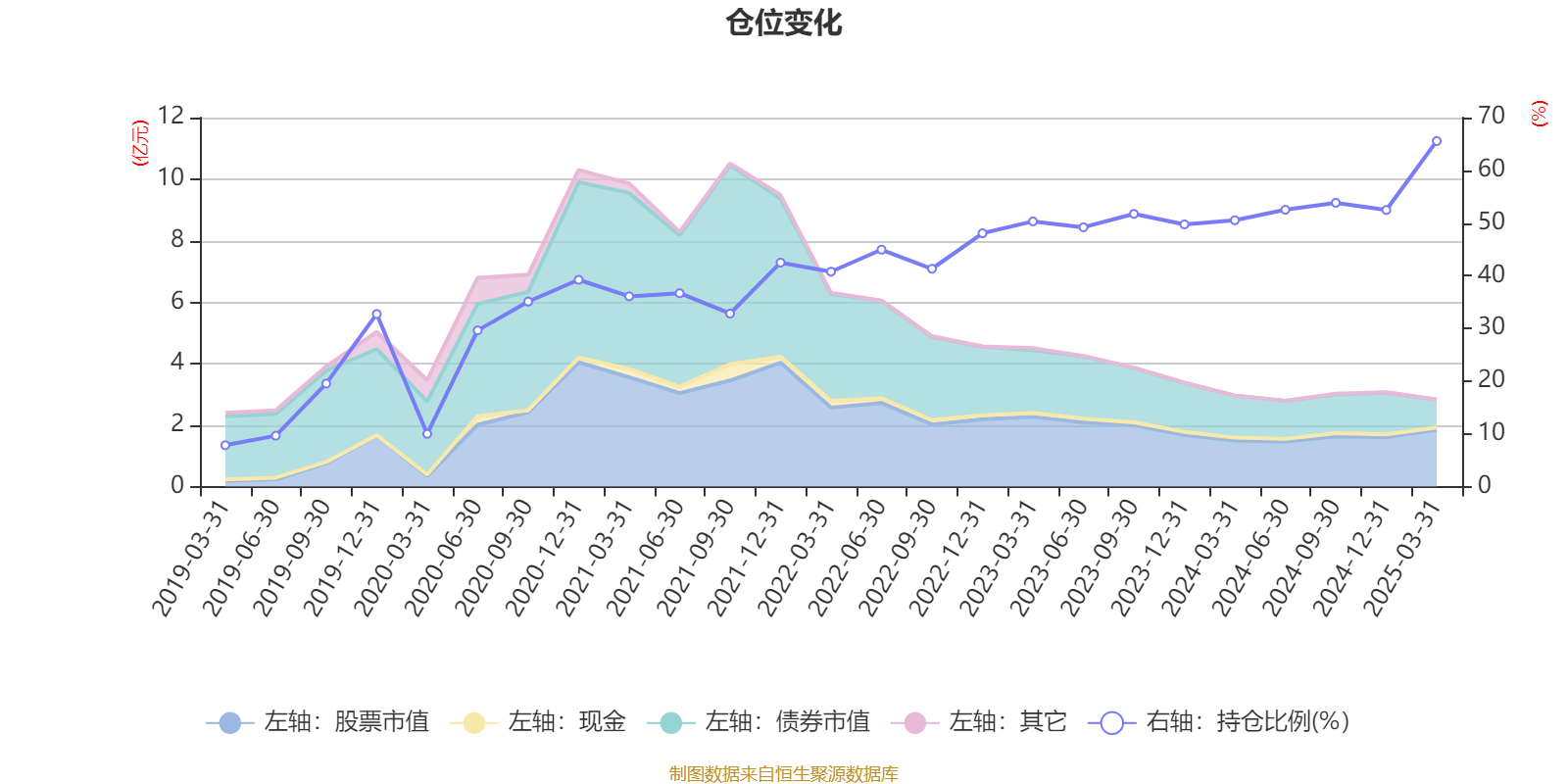 据定期报告数据统计,近三年平均股票仓位为50.85%,同类平均为43.14%。2025年一季度末基金达到65.55%的最高仓位,2019年一季度末最低,为7.84%。