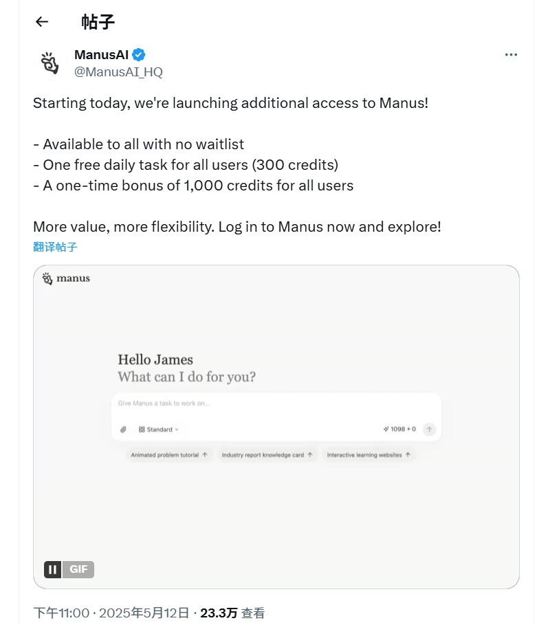 5月12日,曾因注册码被爆炒至10万元、长期处于“一码难求”状态的AI智能体平台Manus,宣布面向全球用户开放注册。Manus在公告中表示,Manus向所有人开放,无需等待名单;所有用户每天可免费执行一项任务(300积分),所有用户一次性获得1000积分奖励。