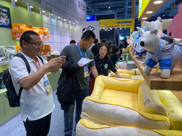 拿起印着卡通图案的冰垫摸摸材质,翻看宠物出行包的内外部结构,拎起狗狗牵引绳查看织物密度……王加刚和同事几乎不放过任何一个宠物用品展位。“我们的产品质量很能打,但设计创意要做调整。还有一点,国内宠物用品的智能化趋势很明显,而我们主要做的是纺织品,今后或许可以跨界合作。”