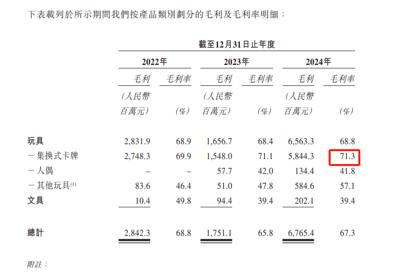与之对应的毛利率则直接高出一众同行。数据显示,2022年到2024年,卡游的集换式卡牌毛利率分别为69.9%、71.1%和71.3%,每年小幅提升。
