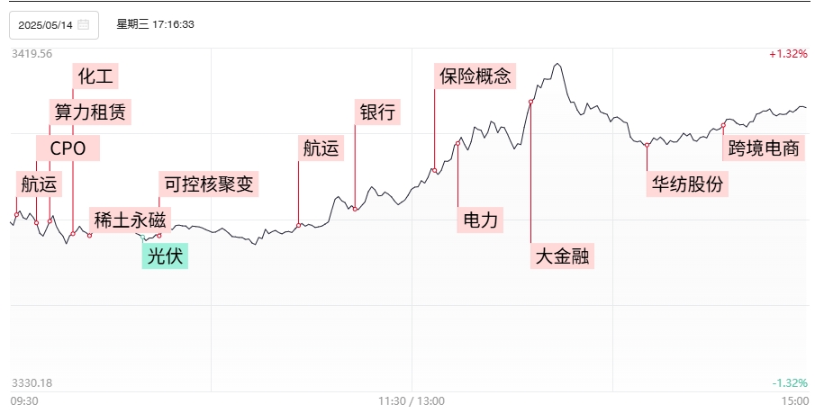 财联社5月15日电,市场午后在金融股带动下震荡走高,创业板指领涨,沪指重回3400点上方。个股跌多涨少,全市场超2800只个股下跌。沪深两市全天成交额1.32万亿,较前日放量252亿。1)受益中美关税大幅下调,业内预计,随着运力调整、货量增加,美线集运市场有望迎来一波抢运潮,集运欧线主力期货收出近3个交易日的第2个涨停。航运板块继续得到资金热捧,宁波海运、宁波远洋等多股实现连板,进而将热度扩散至仓储物流以及跨境电商等方向,青岛金王、保税科技等统一大市场概念前期人气股午后亦纷纷涨停。2)据慧聪化工网数据显示,双季戊四醇价格自2024年10月价格开启飙升一路涨至8万元/吨,涨幅达300%。双季戊四醇龙头中毅达缩量实现连板晋级,股价从3月7日收盘价至今累计上涨超2.5倍,带动尤夫股份、渝三峡A等多只板块内高位人气股上板。3)英伟达表示将在沙特阿拉伯销售数十万颗人工智能芯片,首批1.8万颗最新的“Blackwell ”芯片将提供给沙特阿拉伯人工智能初创公司Humain。但算力硬件股受该消息刺激早盘大幅冲高后迅速震荡回落,多数个股日线呈现长上影走势。而算力租赁方向则表现相对偏强,宏景科技盘中继续创出历史新高,华胜天成等多股更是报收涨停,或仍与部分资金博弈腾讯、阿里一季报中有关算力资本开支数据有关。4)兴业证券研报称,公募新规引导资产配置向沪深300靠拢,由于与业绩基准巨大的“配置缺口”,银行以及非银金融等持仓偏离度较大的板块全天强势,午后中国人保、红塔证券、锦龙股份涨停,银行板块市值更是创纪录突破10万亿。